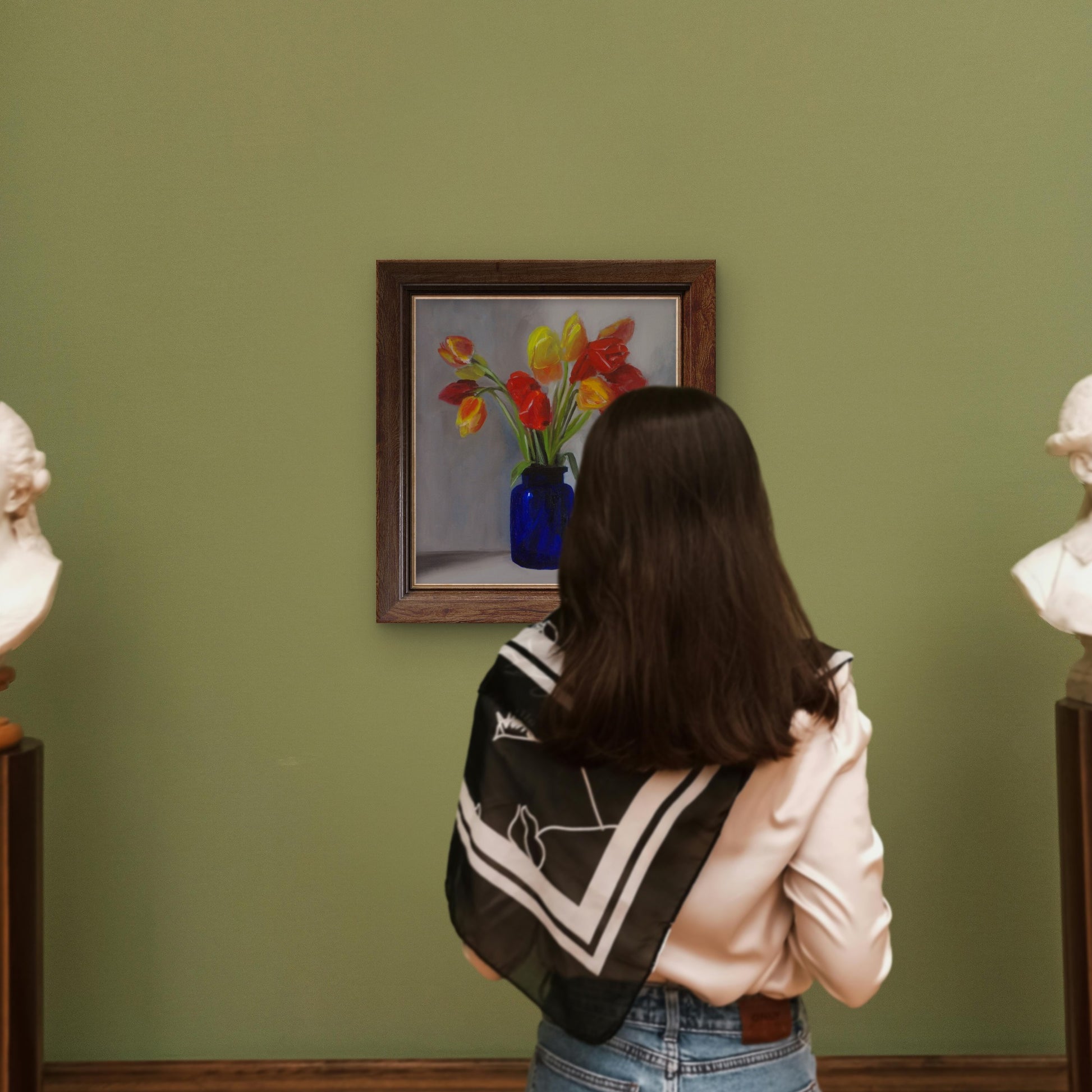 A beautiful still-life oil painting of Tulips picked from Adrian's garden. A slightly muted painting with a neutral background allowing the lustrous colours of the Tulips to sing gently from the vase. The vase is a rich blue glass, as deep a blue as the tulips are red.